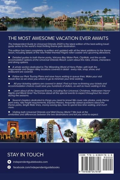 Visiting Universal Orlando? Our guide will help you skip the lines, save money, and understand the theme parks for a stress-free vacation Our bestselling Universal Orlando travel guide series is trusted by families and friends from across the world and helps you create unforgettable memories. This Universal Orlando guide book is new and fully up-to-date for 2020, including details on Hagrid's new roller coaster, a third theme park, new hotels, Volcano Bay and a new Bourne stunt show. All this and more:The Theme Parks - A look at every ride, show, restaurant and more at both theme parks. Volcano Bay - A whole additional chapter dedicated to Universal Orlando's new water park - Volcano Bay. The Hotels - Choosing a place to stay - full coverage of all the on-site hotels Skip the Lines and Touring Plans - Follow our tried and tested ways to skip the lines and minimise your waits. Tickets - How to save money on your tickets and choosing the best one for you. Universal Orlando for Disney Veterans - Been to Walt Disney World before? We explain all the similarities and differences. Express Pass - All the ins and outs of this skip-the-lines service and how to get it at a huge discount. Universal on a Budget - How to save $$$ on your trip, when booking and while on vacation. Dining - Learn about the best places to eat, dining reservations, dining plans and more. Young Kids - It's not all just for adults, we show you how young kids can have fun too. Understand the Theme Parks - We tell you all about Ride lockers, Single Rider lines, Child Swap, Photo Services and much, much more. Transportation - How to get to and around the resort Beyond the Parks - A chapter dedicated to shopping, shows and dining at Universal CityWalk Guests with Disabilities - How Universal helps make your disabled guests' visits as easy as possible. Park Maps - Familiarize yourself with the layout of the park before getting there. Seasonal Events and the Future - Our look at the Christmas, Halloween, Mardi Gras, Run Universal (a brand new race) and other seasons. Plus, a peek into the future of Universal Studios Orlando.
