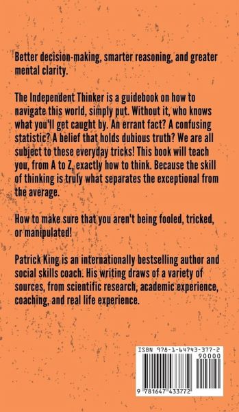 Learn to ask the intelligent questions, draw insight, and analyze situations. Independent thinking is critical thinking. And critical thinking is the key to a life examined. Better decision-making, smarter reasoning, and greater mental clarity. The Independent Thinker is a guidebook on how to navigate this world, simply put. Without it, who knows what you'll get caught by. An errant fact? A confusing statistic? A belief that holds dubious truth? We are all subject to these everyday tricks! This book will teach you, from A to Z, exactly how to think. Because the skill of thinking is truly what separates the exceptional from the average. How to make sure that you aren't being fooled, tricked, or manipulated! Patrick King is an internationally bestselling author and social skills coach. His writing draws of a variety of sources, from scientific research, academic experience, coaching, and real life experience. Protect yourself from bad data, inaccurate statistics, and old wive's tales.The 3 levels of independent thought Critical reading, thinking, and even logic What Nietzsche teaches us about finding out for ourselves Why our feelings, emotions, and even memories are not reality The Paul-Elder framework of critical thinking and examination Most importantly, freedom from your own biases, past, and filters