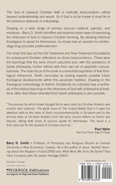 Description: The God of classical Christian faith is radically transcendent--utterly beyond understanding and words. So if God is to be known it must be in the luminous darkness of unknowing. Drawing on a wide range of primary sources--biblical, patristic, and medieval--Barry D. Smith identifies and explores seven ways of expressing the otherness of God in classical Christian thinking. By allowing historical theologians to speak for themselves, he shows how an aversion to ontotheology long precedes postmodernism. The book first lays out the Old Testament and New Testament foundations for subsequent Christian reflections on divine transcendence. These were the teachings that the early church assumed and, with the assistance of Greek philosophy, further refined with their own set of apophatic conceptual tools. The main focus of the book is a sevenfold exposition of that theological refinement. Smith concludes by looking towards possible future theological developments within this apophatic tradition. Drawing on the theological methodology of historic Christianity, he indicates how a synthesis of the biblical teaching on the otherness of God with philosophical traditions other than those inherited from Greek philosophy is also possible. Endorsements: ""The process by which Greek thought forms were used by Christian thinkers was eclectic and nuanced. The great value of The Indescribable God is it pays full attention both to the ideas of God's incomprehensibility in Scripture and to the primary texts of Christian thinkers from the early church fathers to Calvin and beyond, letting both kinds of sources speak for themselves. The result is a first-class tool for the student of Christian doctrine."" --Paul Helm, Teaching Fellow, Regent College About the Contributor(s): Barry D. Smith is Professor of Philosophy and Religious Studies at Crandall University in New Brunswick, Canada. He is the author of Jesus' Twofold Teaching about the Kingdom of God (2009) and What Must We Do to Be Saved? Paul Parts Company with His Jewish Heritage (2007).