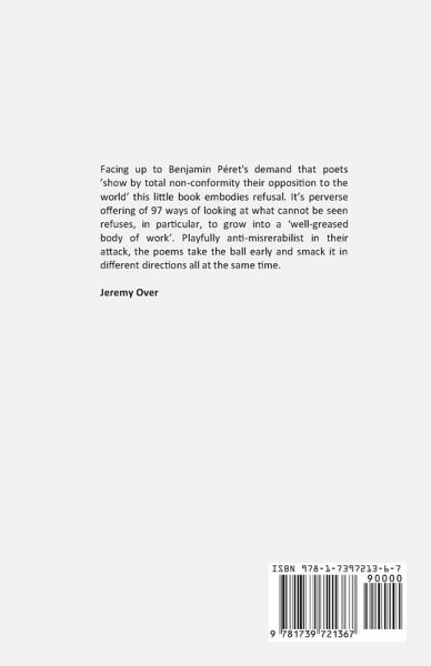 Facing up to Benjamin Péret's demand that poets 'show by total non-conformity their opposition to the world' this little book embodies refusal. It's perverse offering of 97 ways of looking at what cannot be seen refuses, in particular, to grow into a 'well-greased body of work'. Playfully anti-misrerabilist in their attack, the poems take the ball early and smack it in different directions all at the same time. Jeremy Over