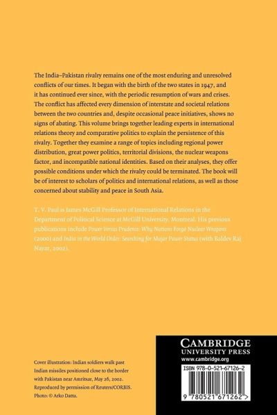 Part I. Introduction: 1. Causes of the India-Pakistan enduring rivalry T. V. Paul; Part II. Theories of Enduring Rivalry and the South Asian Conflict: 2. Theoretical specifications of enduring rivalries: applications to the India-Pakistan case Paul F. Diehl, Gary Goertz and Daniel Saeedi; 3. India-Pakistan conflict in light of general theories of war, rivalry and deterrence John A. Vasquez; 4. The Indo-Pakistani rivalry: prospects for war, prospects for peace Daniel S. Geller; 5. Realpolitik and learning in the India-Pakistan rivalry Russell J. Leng; Part III. Roots of the India-Pakistan Conflict: 6. Major powers and the persistence of the India-Pakistan conflict Ashok Kapur; 7. Nuclear weapons and the prolongation of the India-Pakistan rivalry Saira Khan; 8. National identities and the Pakistan-India conflict Vali Nasr; 9. At the heart of the conflict: irredentism and Kashmir Stephen Saideman; 10. Institutional causes of the Indo-Pakistani rivalry Reeta Chowdhari Tremblay and Julian Schofield; Part IV. Conclusions: 11: South Asia's Embedded conflict: understanding the India-Pakistan rivalry T. V. Paul and William Hogg.