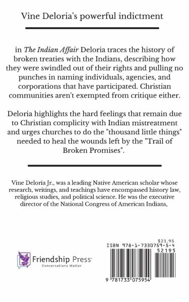 In The Indian Affair Deloria traces the history of broken treaties with the Indians, describing how they were swindled out of their rights and pulling no punches in naming indiviuals, agencies, and corporations that have participated. Christian communities aren't exempted from critique either. ¿Deloria highlights the hard feelings that remain due to Christian complicity with Indian mistreatment and urges churches to do the "thousand little things" needed to heal the wounds left by the "Trail of Broken Promises".