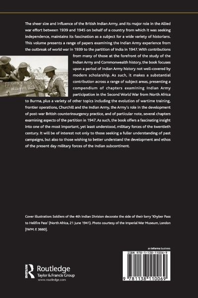 This volume examines the Indian Army between the outbreak of war in 1939 and the partition of India in 1947. With contributions from many of those at the forefront of the study of the Indian Army and Commonwealth history, the book makes a substantial contribution to a range of subjects, from the Indian Army's participation in the Second World War, to the evolution of wartime training, frontier operations, and its role in the development of post-war counterinsurgency practice. The volume concludes with several chapters examining the impact and legacy of Partition in 1947.