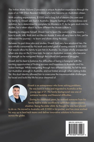 The Indian Mate: Volume 2 uncovers a unique Australian experience through the eyes of an NRI (Non-Resident Indian) who later became an Australian citizen. With crushing expectations, $1000 and a bag full of dreams (his own and his family's), Divesh sets foot in Australia. Despite feelings of homesickness and isolation, he is determined to complete his Masters in IT. As he gets stuck into his studies, he is taken aback by how different the Aussie culture is. Needing to integrate himself, Divesh had to learn the customs of the country - how to walk, talk, think and act like an Aussie. It was all very new to him, yet he embraced the journey - to learn and share along the way. Between his part-time jobs and studies, Divesh had very few emotional ties. He was wholly consumed by his work and initial goal of saving around $150,000 that would allow his family to join him in Australia. So, it was wholly unexpected when one day on the V/Line train, he met an Australian woman, who became his strength as he navigated through the cultural and personal struggles. Divesh did his best to balance the dif¿culties of being a foreigner with the exciting opportunities of ¿nding success and happiness in Australia and his Indian heritage. While navigating through two different worlds, he felt he was not Australian enough in Australia, and not Indian enough when visiting India. Yet, this dual identity allowed him to overcome the insurmountable challenges he faced and build the life he once dreamed of.