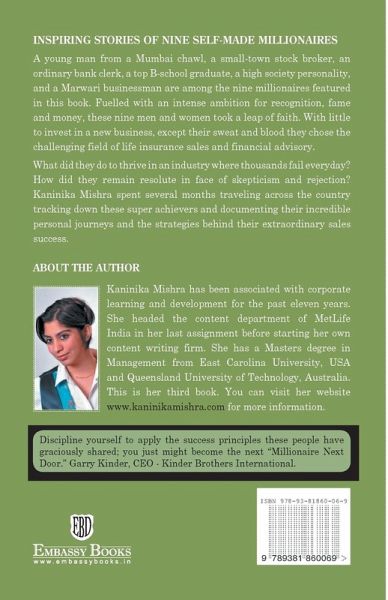 Every day, there are millions of people who become financial services professionals, but only a handful of them become millionaires. So if you have ever wondered what makes them tick and thrive where others fail, this book will provide you with the necessary clues and a few good reasons. The Indian Millionaire Next Door profiles nine successful individuals, who irrespective of their background, took to selling life insurance and financial services, and today are 'millionaires' in their field. Through this book, author, Kaninika Mishra not only traces the inherent qualities that each of this individual possessed to be a good seller, but also highlights their key to success-tips and tricks of the trade that made them crack the deal, when others threw in the towel. The book is a warm collection of true, inspiring stories that would help inculcate the right mindset and attitude to be able to sell well. The stories here nudge you to reconsider your own strategy and inspire you to achieve your own dreams.