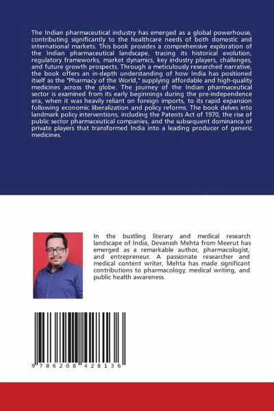 The Indian pharmaceutical industry has emerged as a global powerhouse, contributing significantly to the healthcare needs of both domestic and international markets. This book provides a comprehensive exploration of the Indian pharmaceutical landscape, tracing its historical evolution, regulatory frameworks, market dynamics, key industry players, challenges, and future growth prospects. Through a meticulously researched narrative, the book offers an in-depth understanding of how India has positioned itself as the "Pharmacy of the World," supplying affordable and high-quality medicines across the globe. The journey of the Indian pharmaceutical sector is examined from its early beginnings during the pre-independence era, when it was heavily reliant on foreign imports, to its rapid expansion following economic liberalization and policy reforms. The book delves into landmark policy interventions, including the Patents Act of 1970, the rise of public sector pharmaceutical companies, and the subsequent dominance of private players that transformed India into a leading producer of generic medicines.