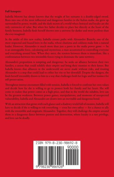 Full Synopsis: Isabella Moretti has always known that the weight of her surname is a double-edged sword. Born into one of the most influential and dangerous families in the Italian mafia, she grew up surrounded by power, wealth, and the dark secrets of a world where betrayal and loyalty are the only currencies of value. But when her father decides to place her directly at the heart of the family business, Isabella finds herself thrown into a universe far darker and more perilous than she ever imagined. In the midst of this new reality, Isabella crosses paths with Alessandro Bianchi, one of the most respected and feared heirs in the mafia, whose charisma and coldness make him a natural leader. However, Alessandro is much more than just a pawn in the mafia power game - he is an unstoppable force, calculating and mysterious, a man accustomed to controlling everyone and everything around him. When they meet, the tension between them is immediate, like a confrontation between two irresistible forces vying to dominate the same territory. Alessandro's proposition is tempting and dangerous: he seeks an alliance between their two families, a union that could solidify their empire and bring their enemies to their knees. But Isabella knows that alliances in the underworld are never made without risks, and trusting Alessandro is a step that could lead to either her rise or her downfall. Despite the dangers, she finds herself irresistibly drawn to him in a way that challenges both her logic and her instinct for self-preservation. Throughout intense encounters filled with tension, Isabella is forced to confront her own values and decide how far she is willing to go to protect both her family and her heart. She will come to realize that power comes at a high price, and that in the world she inhabits, love can be the greatest weakness. Between power games, manipulations, and moments of unexpected vulnerability, Isabella and Alessandro are drawn into an inevitable and dangerous bond. With an attraction that grows with each glance and a shadowy world full of enemies, Isabella will have to decide if she is willing to risk everything - even her own safety - for a chance to ally with the irresistible and enigmatic Alessandro. Together, they will challenge the empire around them in a dangerous dance between passion and destruction, where loyalty is a rare privilege, and love can be deadly.