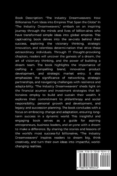 "The Industry Dreamweavers: How Billionaires Turn Ideas into Empires That Span the Globe" In "The Industry Dreamweavers," embark on an inspiring journey through the minds and lives of billionaires who have transformed simple ideas into global empires. This captivating book delves into the secrets behind their success, exploring the visionary thinking, strategic innovation, and relentless determination that drive these extraordinary individuals. Through 17 thought-provoking chapters, readers will uncover the genesis of a dream, the art of visionary thinking, and the power of building a dream team. The book highlights the importance of crafting a compelling brand, innovative product development, and strategic market entry. It also emphasizes the significance of networking, strategic partnerships, and navigating challenges with resilience and adaptability. "The Industry Dreamweavers" sheds light on the financial acumen and investment strategies that billionaires employ to build and sustain their wealth. It explores their commitment to philanthropy and social responsibility, personal growth and development, and legacy and succession planning. The book concludes with a focus on embracing change and adaptation, ensuring long-term success in a dynamic world. This insightful and engaging book serves as a guide for aspiring entrepreneurs, business leaders, and anyone with a dream to make a difference. By sharing the stories and lessons of the world's most successful billionaires, "The Industry Dreamweavers" inspires readers to dream big, think creatively, and turn their own ideas into impactful, world-changing realities.