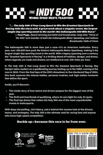 The Indy 500: Where Speed Meets Tradition". . . The Indy 500: A Year-Long Quest to Win the Greatest Spectacle in Racing tells the story well. A great work about a singular event, the largest single-day sporting event in the world-the Indianapolis 500 Mile Race." — Paul Page, Award-winning journalist and broadcaster, long-time “Voice of the 500,” and member of both the Indianapolis Motor Speedway and Indiana Broadcaster Halls of FameThe Indianapolis 500 is more than just a race—it's an American institution. Every year, over 350,000 fans pack the historic Indianapolis Motor Speedway, making it the largest single-day sporting event in the world. With a legacy spanning over a century, the “Greatest Spectacle in Racing” is a thrilling blend of tradition, danger, and drama, where legends are made and dreams are shattered at over 230 miles per hour.In The Indy 500: A Year-Long Quest to Win the Greatest Spectacle in Racing, Ray Hartjen takes readers on a spellbinding journey leading up to the 108th running of the race in 2024. From the final laps of the 2023 showdown to the checkered flag of 2024, this book captures the intense battles, personal rivalries, and high-stakes moments that define the sport.Inside, you’ll discover:The inside story of how teams and drivers prepare for the biggest race of the year. The thrill and heartbreak of qualifying, where 34 cars fight for only 33 spots. The final-lap drama that makes the Indy 500 one of the most unpredictable events in motorsports. With deep storytelling, rich history, and a behind-the-scenes look at the drivers, teams, and strategies, The Indy 500 is the ultimate read for racing fans and anyone who loves high-speed competition. Buckle up—because this race is far from over.