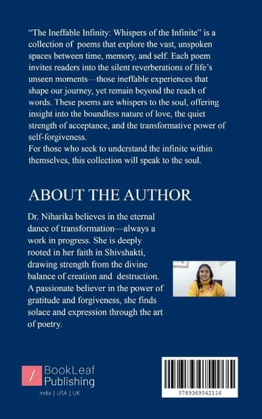 The Ineffable Infinity is not a book of poems. They are whispers to the soul, offering insight into the boundless nature of love, the quiet strength of acceptance, and the transformative power of self-forgiveness. With lyrical grace and raw introspection, it paints a vivid landscape of womanhood, ambition, vulnerability, and hope. It is a celebration of the infinite possibilities within us and the quiet beauty found in embracing both our flaws and dreams. The book is a discovery of a timeless space where every word is a breath, every line a journey, and every poem a whisper to the heart.