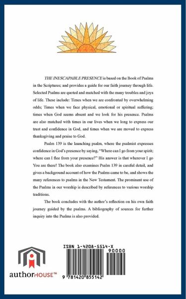 THE INESCAPABLE PRESENCE is based on the Book of Psalms in the Scriptures; and provides a guide for our faith journey through life. Selected Psalms are quoted and matched with the many troubles and joys of life. These include: Times when we are confronted by overwhelming odds; Times when we face physical, emotional or spiritual suffering; times when God seems absent and we look for his presence. Psalms are also matched with times in our lives when we long to express our trust and confidence in God, and times when we are moved to express thanksgiving and praise to God. Psalm 139 is the launching psalm, where the psalmist expresses confidence in God's presence by saying, "Where can I go from your spirit; where can I flee from your presence?" His answer is that wherever I go You are there! The book also examines Psalm 139 in careful detail, and gives a background account of how the Psalms came to be, and shows the many references to psalms in the New Testament. The prominent use of the Psalms in our worship is described by references to various worship traditions. The book concludes with the author's reflection on his own faith journey guided by the psalms. A bibliography of sources for further inquiry into the Psalms is also provided.