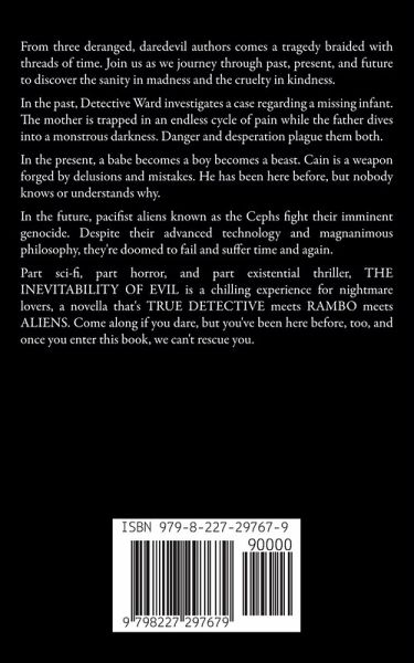 From three deranged, daredevil authors comes a tragedy braided with threads of time. Join us as we journey through past, present, and future to discover the sanity in madness and the cruelty in kindness. In the past, Detective Ward investigates a case regarding a missing infant. The mother is trapped in an endless cycle of pain while the father dives into a monstrous darkness. Danger and desperation plague them both. In the present, a babe becomes a boy becomes a beast. Cain is a weapon forged by delusions and mistakes. He has been here before, but nobody knows or understands why. In the future, pacifist aliens known as the Cephs fight their imminent genocide. Despite their advanced technology and magnanimous philosophy, they're doomed to fail and suffer time and again. Part sci-fi, part horror, and part existential thriller, THE INEVITABILITY OF EVIL is a chilling experience for nightmare lovers, a novella that's TRUE DETECTIVE meets RAMBO meets ALIENS. Come along if you dare, but you've been here before, too, and once you enter this book, we can't rescue you.