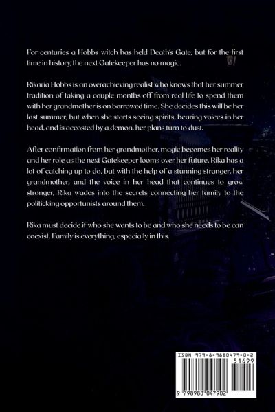 For centuries a Hobbs witch has held Death's Gate, but for the first time in history, the next Gatekeeper has no magic. Rikaria Hobbs is an overachieving realist who knows that her summer tradition of taking a couple months off from real life to spend them with her grandmother is on borrowed time. She decides this will be her last summer, but when she starts seeing spirits, hearing voices in her head, and is accosted by a demon, her plans turn to dust. After confirmation from her grandmother, magic becomes her reality and her role as the next Gatekeeper looms over her future. Rika has a lot of catching up to do, but with the help of a stunning stranger, her grandmother, and the voice in her head that continues to grow stronger, Rika wades into the secrets connecting her family to the politicking opportunists around them. Rika must decide if who she wants to be and who she needs to be can coexist. Family is everything, especially in this.