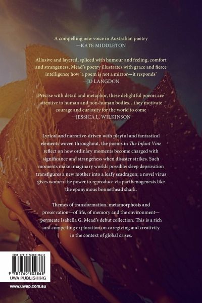 Lyrical and narrative-driven with playful and fantastical elements woven throughout, the poems in The Infant Vine reflect on how ordinary moments become charged with significance and strangeness when disaster strikes. Such moments make imaginary worlds possible: sleep deprivation transfigures a new mother into a leafy sea dragon; a novel virus gives women the power to reproduce via parthenogenesis like the eponymous bonnethead shark. Themes of transformation, metamorphosis and preservation-of life, of memory and the environment-permeate Isabella G. Mead's debut collection. This is a rich and compelling exploration on caregiving and creativity in the context of global crises. A compelling new voice in Australian poetry-Kate Middleton Allusive and layered, spliced with humour and feeling, comfort and strangeness, Mead's poetry illustrates with grace and fierce intelligence how 'a poem is not a mirror-it responds'-Jo Langdon Precise with detail and metaphor, these delightful poems are attentive to human and non-human bodies...they motivate courage and curiosity for the world to come-Jessica L. Wilkinson