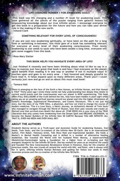 "There is emerging on the face of the Earth a New Human, an Infinite Human and that Human is YOU!" Thirty years ago I wrote these words not fully understanding how deeply they relate to current world events and the consciousness wars our planet is NOW experiencing. This is not just my story but the story of my TWIN SOUL, a physician and how we tried to change the course of modern medicine. This book offers FULL DISCLOSURE of the truth behind the lies that have been hidden in plain sight while taking you on an amazing spiritual journey around our planet and into the higher dimensions of Esoteric Knowledge, Supernatural Phenomenon, and Cosmic Disclosure. This is a Love Story, a Hero's Journey, an Alchemist's Memoir of twin souls who managed to navigate through the world of illusion, heal their past wounds and create an Eternal Love that survived even death! But above all, STAR SEEDS this is your story of the TRUE Liberation that only comes from Awakening from the Dream Spell and ORGANIC ASCENSION, to become the Master Builders of the Infinite New 5D EARTH! Because YOU ARE INFINITE! ALL THAT IS, EVER HAS BEEN AND EVER SHALL BE!!