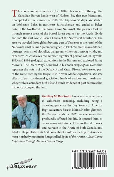 This book contains the story of an 870-mile canoe trip through the Canadian Barren Lands west of Hudson Bay that two friends and I completed in the summer of 1988. The trip took 55 days. We started on Wollaston Lake, in northwest Saskatchewan and ended at Baker Lake in the Northwest Territories (now Nunavut). The journey took us through remote areas of the boreal forest country to the Arctic divide and into the vast Barren Lands of the Northwest Territories. The area we traveled through has become part of Nunavut as the result of the Nunavut Land Claims settlement. We faced many difficult portages, swarms of blackflies, dangerous whitewater, strong winds, and expansive ice-cold lakes. We retraced significant portions of J.B Tyrrell's 1893 and 1894 geological expeditions in the Barrens and explored Farley Mowat's "The Deer's Way", described in his book People of the Deer, that separates the waters of the Dubawnt and Kazan Rivers. We traveled part of the route used by the tragic Arthur Moffat expedition in 1955. We saw effects of past continental glaciation, herds of caribou and muskoxen, white wolves, abundant bird life and much evidence of past cultures that had once occupied the land.
