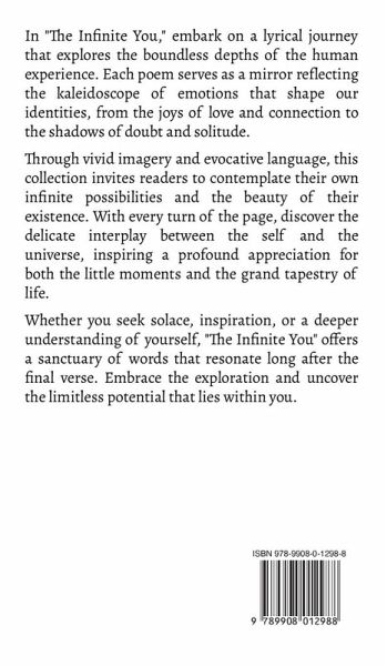 In "The Infinite You," embark on a lyrical journey that explores the boundless depths of the human experience. Each poem serves as a mirror reflecting the kaleidoscope of emotions that shape our identities, from the joys of love and connection to the shadows of doubt and solitude. Through vivid imagery and evocative language, this collection invites readers to contemplate their own infinite possibilities and the beauty of their existence. With every turn of the page, discover the delicate interplay between the self and the universe, inspiring a profound appreciation for both the little moments and the grand tapestry of life. Whether you seek solace, inspiration, or a deeper understanding of yourself, "The Infinite You" offers a sanctuary of words that resonate long after the final verse. Embrace the exploration and uncover the limitless potential that lies within you.