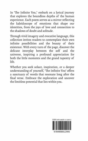 In "The Infinite You," embark on a lyrical journey that explores the boundless depths of the human experience. Each poem serves as a mirror reflecting the kaleidoscope of emotions that shape our identities, from the joys of love and connection to the shadows of doubt and solitude. Through vivid imagery and evocative language, this collection invites readers to contemplate their own infinite possibilities and the beauty of their existence. With every turn of the page, discover the delicate interplay between the self and the universe, inspiring a profound appreciation for both the little moments and the grand tapestry of life. Whether you seek solace, inspiration, or a deeper understanding of yourself, "The Infinite You" offers a sanctuary of words that resonate long after the final verse. Embrace the exploration and uncover the limitless potential that lies within you.