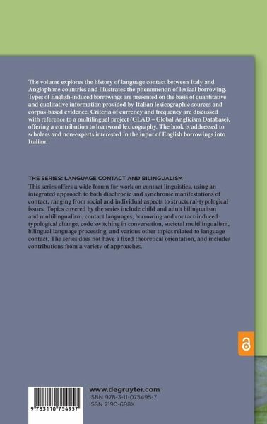 The volume explores the history of language contact between Italy and Anglophone countries and illustrates the phenomenon of lexical borrowing. Types of English-induced borrowings are presented on the basis of quantitative and qualitative information provided by Italian lexicographic sources and corpus-based evidence. Criteria of currency and frequency are discussed with reference to a multilingual project (GLAD - Global Anglicism Database), offering a contribution to loanword lexicography. The book is addressed to scholars and non-experts interested in the input of English borrowings into Italian.