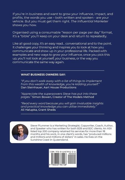 If you're in business and want to grow your influence, impact, and profits, the words you use - both written and spoken - are your vehicle. But you must get them right. The Influential Marketer shows you how. Organised using a consumable "lesson per page per day" format, it's a "bible" you'll keep on your desk and return to repeatedly. Like all good copy, it's an easy read... conversational and to the point. It challenges your thinking and inspires you to look at how you communicate and show up in your professional life. Packed with examples and new ways to grow your influence, once you pick this up, you'll not look at yourself, your business, or the way you communicate the same way again.