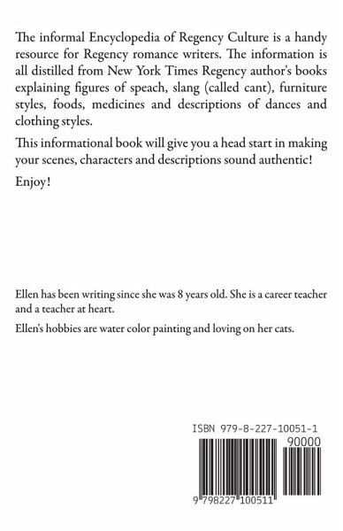 The informal Encyclopedia of Regency Culture is a handy resource for Regency romance writers. The information is all distilled from New York Times Regency author's books explaining figures of speach, slang (called cant), furniture styles, foods, medicines and descriptions of dances and clothing styles. This informational book will give you a head start in making your scenes, characters and descriptions sound authentic! Enjoy!