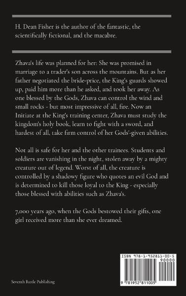 Zhava's life was planned for her: She was promised in marriage to a trader's son across the mountains. But as her father negotiated the bride-price, the King's guards showed up, paid him more than he asked, and took her away. As one blessed by the Gods, Zhava can control the wind and small rocks - but most impressive of all, fire. Now an Initiate at the King's training center, Zhava must study the kingdom's holy book, learn to fight with a sword, and hardest of all, take firm control of her Gods'-given abilities. Not all is safe for her and the other trainees. Students and soldiers are vanishing in the night, stolen away by a mighty creature out of legend. Worst of all, the creature is controlled by a shadowy figure who quotes an evil God and is determined to kill those loyal to the King - especially those blessed with abilities such as Zhava's. 7,000 years ago, when the Gods bestowed their gifts, one girl received more than she ever dreamed.