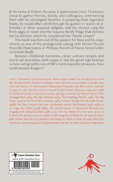 At his home in Velletri, the actor and gastronome Ugo Tognazzi loved to gather friends, family, and colleagues, entertaining them with his extravagant theatrics. In preparing those legendary feasts, he would often stroll through his garden in search of artichokes and other seasonal delights; visit his chicken coop for fresh eggs; or reach into the massive family fridge that dominated his kitchen, which he considered the "family chapel." This book was born out of his passion for food and his experiences as one of the protagonists (along with Michelle Piccoli, Marcello Mastroianni, and Philippe Noiret) of Marco Ferreri's film La grande bouffe. Between childhood memories, clever culinary recipes, and movie set anecdotes, both happy and sad, the great Ugo teaches us how eating well is one of life's most exquisite pleasures. How could anyone disagree?