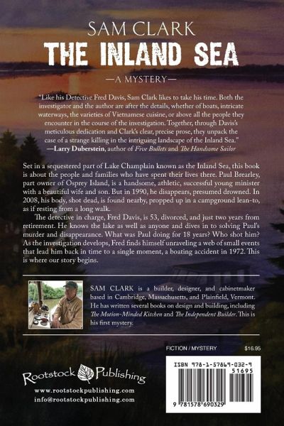 Set in a sequestered part of Lake Champlain known as the Inland Sea, this book is about the people and families who have spent their lives there. Paul Brearley, part owner of Osprey Island, is a handsome, athletic, successful young minister with a beautiful wife and son. In 1990, he suddenly disappears, presumed drowned. Eighteen years later, in 2008, his body, shot dead, is found nearby propped up in a campground lean-to, as if resting from a long walk. The detective in charge, Fred Davis, is 53, divorced, and just two years from retirement. He knows the lake as well as anyone and dives in to solving Paul's murder and disappearance. What was Paul doing for 18 years? Who shot him? As the investigation develops, Fred finds himself unraveling a web of small events that lead him back in time to a single moment, a boating accident in 1972. This is where our story begins.
