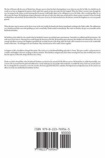 The Inn of Dreams tells the story of Xenda Grey. He grew up on a farm but had a burning desire to see what was over the far hills. As a dutiful son, he would never hurt or disappoint his parents which made him a good son but also made him feel trapped. When the Duke's recruiter came through the area, he jumped at the chance to join knowing that his parents could hardly object to his willingness to serve his Duke. After a tearful goodbye, he set off to meet his future. He had dreams of great adventures with men of valor who other men envied and for whom women swooned. In fact, he mostly scrubbed floors and marched. He determined that, in his years of service, he had marched twice the distance around the kingdom on a two acre parade ground. When the time came to muster out he chose to stay in the city. Luckily, he found work almost immediately working at the Duke's stable. The stablemaster was a kind-hearted little man with sparkling eyes and a round belly. Xenda settled in immediately. The work was familiar, the pay was reasonable and he had food and shelter. He had been at the stable for a few month when he decided to venture out and find some entertainment. Instead he was robbed and left unconscious. He woke up in Zora's lean-to. Meeting Zora would change the direction of his life. He found his great adventure that thrilled and sickened him. His acts of courage and efforts to protect the kingdom earned him the accolade Favorite of the King. After the battle, all he wanted was to return to the comfortable routine of the farm. As will happen, he met Charlotte. They married and set off to make a future together. As happens in life, a breakdown changed their plans. They took over an abandoned building and made it a home. They gave comfort and protection to a mother and daughter who were escaping an abusive situation. Their kindness and generosity led to them meeting four men who would become woven into the tapestry of their life, along with their niece, Daisy. Xenda was dealt a brutal blow when his beloved Charlotte was found to be seriously ill. She did not survive. He buried her in a field of periwinkle, near a stream. He recovered from his grief and soldiered on. As the innkeeper, he met people with wonderful or terrible life stories. Each one carried a lesson. He was changed by his encounters as were the travelers. He lived a good life full of love and duty. He helped and was helped by many. In the end, he was able to sit in the sun satisfied that he had done his best.