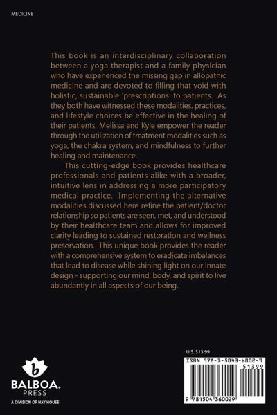 This book is an interdisciplinary collaboration between a yoga therapist and a family physician who have experienced the missing gap in allopathic medicine and are devoted to filling that void with holistic, sustainable 'prescriptions' to patients. As they both have witnessed these modalities, practices, and lifestyle choices be effective in the healing of their patients, Melissa and Kyle empower the reader through the utilization of treatment modalities such as yoga, the chakra system, and mindfulness to further healing and maintenance. This cutting-edge book provides healthcare professionals and patients alike with a broader, intuitive lens in addressing a more participatory medical practice. Implementing the alternative modalities discussed here refine the patient/doctor relationship so patients are seen, met, and understood by their healthcare team and allows for improved clarity leading to sustained restoration and wellness preservation. This unique book provides the reader with a comprehensive system to eradicate imbalances that lead to disease while shining light on our innate design - supporting our mind, body, and spirit to live abundantly in all aspects of our being.