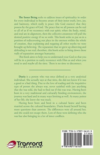 The Inner Being seeks to address issues of spirituality in order for every individual to become aware of their inner truth, love, joy, and harmony, which really is peace (the God essence) that they possess by the grace of God. The peace that we all possess can be real to all of us if we reconnect with our spirit; when the body, mind, and soul are in alignment, then the collective awareness will pull the desired positive energy if we so wish. This book seeks to put us in a position of rediscovering our place in the oneness within the whole of creation, thus explaining and negating all other myths we were brought up believing. The separation that we grew up observing and defending is not real; therefore, this book seeks to bring down those walls of separation amongst humanity. This book aims to help you to understand your God so that you will be in a position to easily reconnect with him as and when you need to and maybe all the time. There is no time to disconnect.