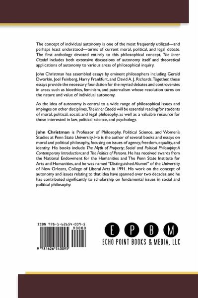 The concept of individual autonomy is one of the most frequently utilized—and perhaps least understood—terms of current moral, political, and legal debate. The first anthology devoted entirely to this philosophical concept, The Inner Citadel includes both extensive discussions of autonomy itself and theoretical applications of autonomy to various areas of philosophical inquiry. John Christman has assembled essays by eminent philosophers including Gerald Dworkin, Joel Feinberg, Harry Frankfurt, and David A. J. Richards. Together, these essays provide the necessary foundation for the myriad debates and controversies in areas such as bioethics, feminism, and paternalism whose resolution turns on the nature and value of individual autonomy. As the idea of autonomy is central to a wide range of philosophical issues and impinges on other disciplines, The Inner Citadel will be essential reading for students of moral, political, social, and legal philosophy, as well as a valuable resource for those interested in law, political science, and psychology. John Christman is Professor of Philosophy, Political Science, and Women's Studies at Penn State University. He is the author of several books and essays on moral and political philosophy, focusing on issues of agency, freedom, equality, and identity. His books include The Myth of Property; Social and Political Philosophy: A Contemporary Introduction; and The Politics of Persons. He has received awards from the National Endowment for the Humanities and The Penn State Institute for Arts and Humanities, and he was named "Distinguished Alumni" of the University of New Orleans, College of Liberal Arts in 1991. His work on the concept of autonomy and issues relating to that idea have spanned over two decades, and he has contributed significantly to scholarship on fundamental issues in social and political philosophy.