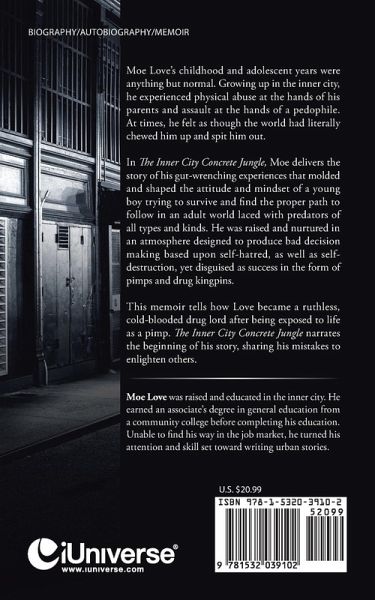 Moe Love's childhood and adolescent years were anything but normal. Growing up in the inner city, he experienced physical abuse at the hands of his parents and assault at the hands of a pedophile. At times, he felt as though the world had literally chewed him up and spit him out. In ¬The Inner City Concrete Jungle, Moe delivers the story of his gut-wrenching experiences that molded and shaped the attitude and mindset of a young boy trying to survive and ¬ find the proper path to follow in an adult world laced with predators of all types and kinds. He was raised and nurtured in an atmosphere designed to produce bad decision making based upon self-hatred, as well as selfdestruction, yet disguised as success in the form of pimps and drug kingpins. This memoir tells how Love became a ruthless, cold-blooded drug lord after being exposed to life as a pimp. ¬ The Inner City Concrete Jungle narrates the beginning of his story, sharing his mistakes to enlighten others.