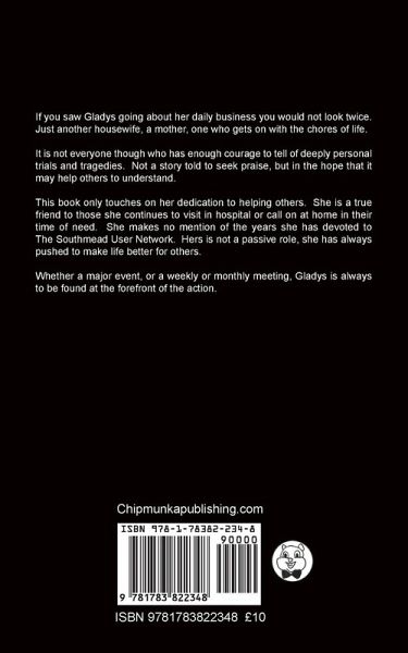 If you saw Gladys going about her daily business you would not look twice. Just another housewife, a mother, one who gets on with the chores of life. It is not everyone though who has enough courage to tell of deeply personal trials and tragedies. Not a story told to seek praise, but in the hope that it may help others to understand. This book only touches on her dedication to helping others. She is a true friend to those she continues to visit in hospital or call on at home in their time of need. She makes no mention of the years she has devoted to The Southmead User Network. Hers is not a passive role, she has always pushed to make life better for others. Whether a major event, or a weekly or monthly meeting, Gladys is always to be found at the forefront of the action.