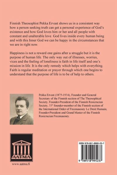 Finnish Theosophist Pekka Ervast shows us in a consistent way how a person seeking truth can get a personal experience of God's existence and how God loves him or her and all people with constant and unalterable love. God lives inside every human being and with this Inner God we can be happy in the circumstances that we are in right now. Happiness is not a reward one gains after a struggle but it is the purpose of human life. The only way out of illnesses, worries, vices and the feeling of loneliness is faith in life itself and one's mission in life. It is the only remedy which helps with everything. Faith is regular meditation or prayer through which one begins to understand that the purpose of life is to be of help to others.