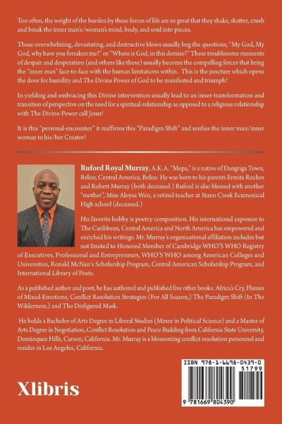 Too often, the weight of the burden by these forces of life are so great that they shake, shatter, crush and break the inner man's/woman's mind, body, and soul into pieces. These overwhelming, devastating, and destructive blows usually beg the questions, "My God, My God, why have you forsaken me?" or "Where is God, in this demise?" These troublesome moments of despair and desperation (and others like these) usually become the compelling forces that bring the "inner man" face-to-face with the human limitations within. This is the juncture which opens the door for humility and The Divine Power of God to be manifested and triumph! In yielding and embracing this Divine intervention usually lead to an inner-transformation and transition of perspective on the need for a spiritual-relationship as opposed to a religious-relationship with The Divine-Power call Jesus! It is this "personal-encounter" it reaffirms this "Paradigm Shift" and unifies the inner man/inner woman to his/her Creator!