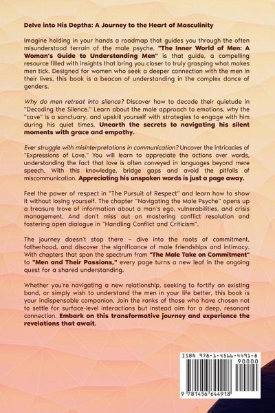 Delve into His Depths: A Journey to the Heart of Masculinity Imagine holding in your hands a roadmap that guides you through the often misunderstood terrain of the male psyche. "The Inner World of Men: A Woman's Guide to Understanding Men" is that guide, a compelling resource filled with insights that bring you closer to truly grasping what makes men tick. Designed for women who seek a deeper connection with the men in their lives, this book is a beacon of understanding in the complex dance of genders. Why do men retreat into silence? Discover how to decode their quietude in "Decoding the Silence." Learn about the male approach to emotions, why the "cave" is a sanctuary, and upskill yourself with strategies to engage with him during his quiet times. Unearth the secrets to navigating his silent moments with grace and empathy. Ever struggle with misinterpretations in communication? Uncover the intricacies of "Expressions of Love." You will learn to appreciate the actions over words, understanding the fact that love is often conveyed in languages beyond mere speech. With this knowledge, bridge gaps and avoid the pitfalls of miscommunication. Appreciating his unspoken words is just a page away. Feel the power of respect in "The Pursuit of Respect" and learn how to show it without losing yourself. The chapter "Navigating the Male Psyche" opens up a treasure trove of information about a man's ego, vulnerabilities, and crisis management. And don't miss out on mastering conflict resolution and fostering open dialogue in "Handling Conflict and Criticism". The journey doesn't stop there - dive into the roots of commitment, fatherhood, and discover the significance of male friendships and intimacy. With chapters that span the spectrum from "The Male Take on Commitment" to "Men and Their Passions," every page turns a new leaf in the ongoing quest for a shared understanding. Whether you're navigating a new relationship, seeking to fortify an existing bond, or simply wish to understand the men in your life better, this book is your indispensable companion. Join the ranks of those who have chosen not to settle for surface-level interactions but instead aim for a deep, resonant connection. Embark on this transformative journey and experience the revelations that await.