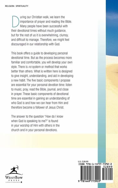 During our Christian walk, we learn the importance of prayer and reading the Bible. Many people have been successful with their devotional times without much guidance, but for the rest of us it is overwhelming, clumsy, and difficult to manage. Therefore, we might feel discouraged in our relationship with God. This book offers a guide to developing personal devotional time. But as the process becomes more familiar and comfortable, you will develop your own style. There is no system or method that works better than others. What is written here is designed to give insight, understanding, and aid in developing a new habit. The five basic components I propose are essential for your personal devotion time: listen to music, pray, read the Bible, journal, and close in prayer. These basic components of devotional time are essential in gaining an understanding of who God is and how we can hear from Him and therefore become a follower of Jesus Christ. The answer to the question "How do I know when God is speaking to me?" is found in your worship of Him with others in the church and in your personal devotions.