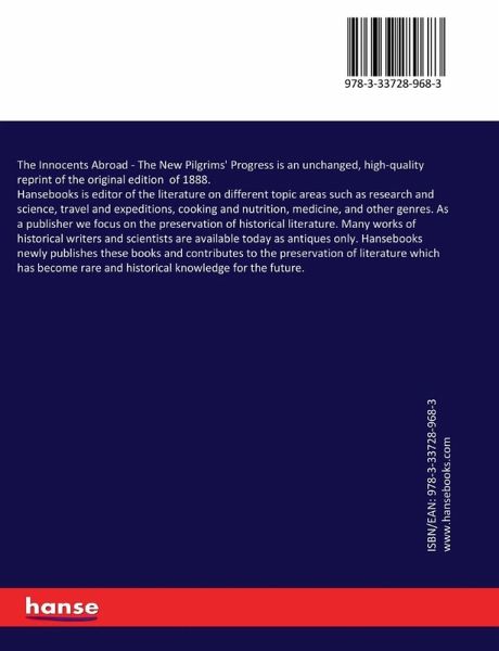 The Innocents Abroad - The New Pilgrims' Progress is an unchanged, high-quality reprint of the original edition of 1888.Hansebooks is editor of the literature on different topic areas such as research and science, travel and expeditions, cooking and nutrition, medicine, and other genres. As a publisher we focus on the preservation of historical literature. Many works of historical writers and scientists are available today as antiques only. Hansebooks newly publishes these books and contributes to the preservation of literature which has become rare and historical knowledge for the future.