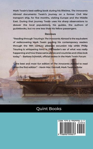 An annotated edition of Mark Twain's The Innocents Abroad, Twain's best-selling book in his lifetime, and the book that made him an international celebrity. This edition includes:All original illustrations from the first edition. Over 1200 footnotes covering the people, places, events, and even the words used in this classic travel book. Eight Appendixes, including information on the passengers, officers, and crew. A lexicon including hundreds of words, all defined in the book. A comprehensive index. Published in 1869, the book is based on what was the first organized cruise ship journey, taking a group of wealthy American tourists (and Twain) to Europe and the Middle East. Twain and his fellow excursionists visited the Azores, Gibraltar, Greece, Italy, France, Spain, Morocco, and the Ottoman Empire (in locations that today would be Turkey, Lebanon, Syria, and Israel). The book looks at Americans and Europeans, and the art and literature that made up the Western canon up to that point. Twain finds himself an art critic visiting some of the most famous works of art in France and Italy, giving his very American perspective. Twain navigates many quarantines due to cholera in that pre-antibiotic age. Woven into the book are his knowledge of the Bible and literary works. Finally his travels in the Holy Land shatter his romantic view of the land based on the Bible and previous authors' descriptions of the land.