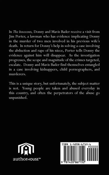 In The Innocents, Donny and Mavis Bader receive a visit from Jim Porter, a lawman who has evidence implicating Donny in the murder of two men involved in his previous wife's death. In return for Donny's help in solving a case involving the abduction and rape of his niece, Porter tells Donny the evidence against him will disappear. As the investigation progresses, the scope and magnitude of the crimes targeted, escalate. Donny and Mavis Bader find themselves entangled in a case involving kidnappers, child pornographers, and murderers. This is a unique story, but unfortunately, the subject matter is not. Young people are taken and abused everyday in this country, and often the perpetrators of the abuse go unpunished.