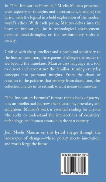 In "The Innovation Formula," Meelis Maurus presents a vivid tapestry of thoughts and observations, blending the lyrical with the logical in a bold exploration of the modern world's ethos. With each poem, Maurus delves into the heart of innovation-be it technological advancement, personal breakthroughs, or the revolutionary shifts in society. Crafted with sharp intellect and a profound sensitivity to the human condition, these poems challenge the reader to see beyond the mundane. Maurus uses language as a tool to dissect and reconstruct the familiar, turning everyday concepts into profound insights. From the chaos of creation to the patterns that emerge from disruption, this collection invites us to rethink what it means to innovate. "The Innovation Formula" is more than a book of poetry; it is an intellectual journey that questions, provokes, and enlightens. Maurus's work is essential reading for anyone who seeks to understand the intersections of creativity, technology, and human emotion in the 21st century. Join Meelis Maurus on this lyrical voyage through the landscapes of change-where poetry meets innovation, and words forge the future. Copyright © 2024 Book Fairy Publishing