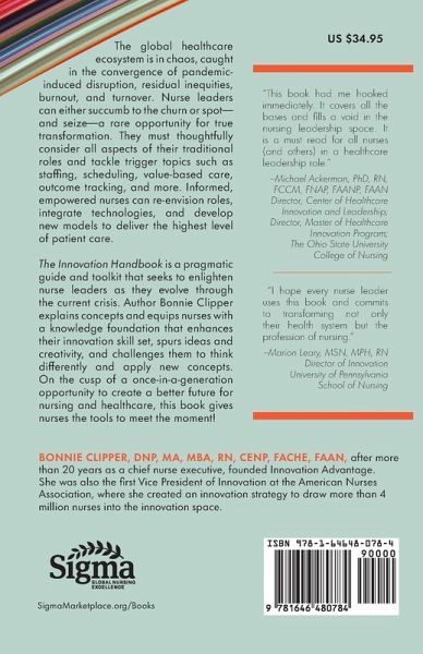 The global healthcare ecosystem is in chaos, caught in the convergence of pandemic-induced disruption, residual inequities, burnout, and turnover. Nurse leaders can either succumb to the churn or spot-and seize-a rare opportunity for true transformation. They must thoughtfully consider all aspects of their traditional roles and tackle trigger topics such as staffing, scheduling, value-based care, outcome tracking, and more. Informed, empowered nurses can re-envision roles, integrate technologies, and develop new models to deliver the highest level of patient care. The Innovation Handbook is a pragmatic guide and toolkit that seeks to enlighten nurse leaders as they evolve through the current crisis. Author Bonnie Clipper explains concepts and equips nurses with a knowledge foundation that enhances their innovation skill set, spurs ideas and creativity, and challenges them to think differently and apply new concepts. On the cusp of a once-in-a-generation opportunity to create a better future for nursing and healthcare, this book gives nurses the tools to meet the moment!