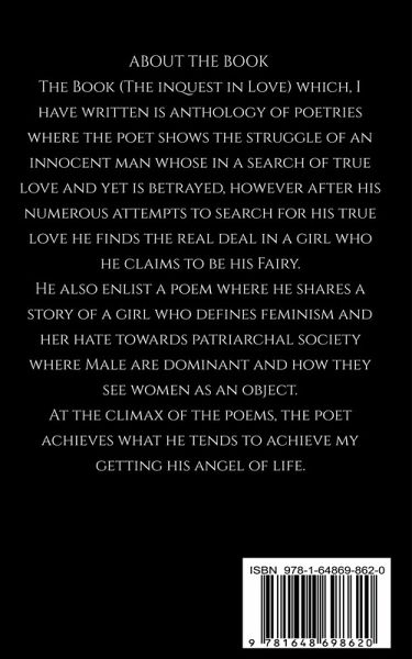 The Book (The inquest in Love) which, I have written is anthology of poetries where the poet shows the struggle of an innocent man whose in a search of true love and yet is betrayed, however after his numerous attempts to search for his true love he finds the real deal in a girl who he claims to be his Fairy. He also enlist a poem where he shares a story of a girl who defines feminism and her hate towards patriarchal society where Male are dominant and how they see women as an object. At the climax of the poems, the poet achieves what he tends to achieve my getting his angel of life.