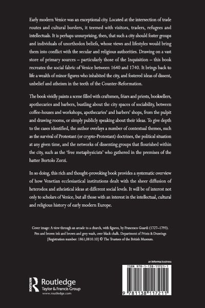 Early modern Venice was an exceptional city. Located at the intersection of trade routes and cultural borders, it teemed with visitors, traders, refugees and intellectuals. It is perhaps unsurprising, then, that such a city should foster groups and individuals of unorthodox beliefs, whose views and life styles would bring them into conflict with the secular and religious authorities. Drawing on a vast store of primary sources - particularly those of the Inquisition - this book recreates the social fabric of Venice between 1640 and 1740. It brings back to life a wealth of minor figures who inhabited the city, and fostered ideas of dissent, unbelief and atheism in the teeth of the Counter-Reformation. The book vividly paints a scene filled with craftsmen, friars and priests, booksellers, apothecaries and barbers, bustling about the city spaces of sociability, between coffee-houses and workshops, apothecaries' and barbers' shops, from the pulpit and drawing rooms, or simply publicly speaking about their ideas. To give depth to the cases identified, the author overlays a number of contextual themes, such as the survival of Protestant (or crypto-Protestant) doctrines, the political situation at any given time, and the networks of dissenting groups that flourished within the city, such as the 'free metaphysicists' who gathered in the premises of the hatter Bortolo Zorzi. In so doing this rich and thought provoking book provides a systematic overview of how Venetian ecclesiastical institutions dealt with the sheer diffusion of heterodox and atheistical ideas at different social levels. It will be of interest not only to scholars of Venice, but all those with an interest in the intellectual, cultural and religious history of early-modern Europe.