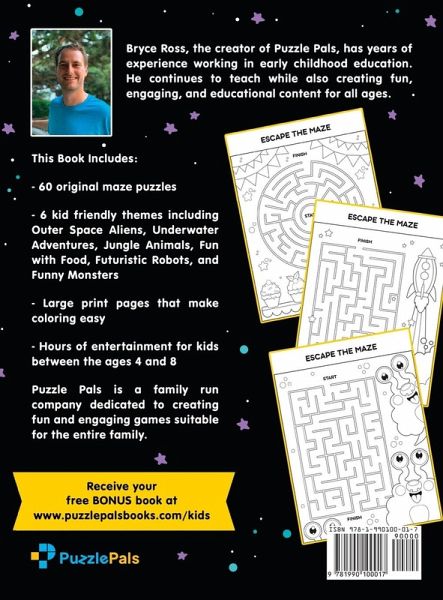 This INSANELY FUN maze book will keep your child entertained for hours! These originally illustrated ESCAPE THE MAZE puzzles will help children (Ages 4-8) succeed in problem solving, pen control, and creativity. Children will have a blast coloring in our 'Space', 'Underwater', 'Robot', 'Food', 'Monster', and 'Jungle' themed coloring pages. Your special boy or girl will enjoy escaping our challenging mazes while coloring our beautifully designed pictures. These types of puzzles stimulate the development of fine motor skills, problem solving skills, and creative ability. The Insanely Fun Maze Book for Kids includes: 60 original escape the maze puzzles Large print pages that make coloring easy Outer space, jungle, robot, food, monster, and underwater themes Hours of entertainment for kids between the ages 4 and 8 Beautiful illustrations for coloring ¿ Expand Your Child's Mind Today by Clicking the "Add to Cart" Button