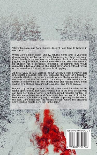 Seventeen-year-old Cara Hughes doesn't have time to believe in monsters. When Cara's older sister, Shelby, returns home after a year-long disappearance, unable to say what happened or where she went, Cara's family is thrown into turmoil-again. As it is, Cara's barely juggling her job, school, and volunteer work, and she's desperate to be chosen for a corporate internship-something that would guarantee a two-year degree she could never afford without relying on the same loans that left her parents struggling. At first, Cara is just worried about Shelby's odd behavior and unpredictable moods, then she discovers the body of a teenager, viciously attacked, in the very woods where Shelby vanished. And the teen is just the first victim. Cara clings to the belief that an animal is responsible for the deaths until she realizes she's being stalked by a strange creature in the woods-and it's no animal. Plagued by strange visions and with her carefully-balanced life falling apart around her, Cara reaches out to the only person who can help her, Lucas Powell, a self-proclaimed monster hunter. His theories are outrageous, and Cara hopes her decision to trust him isn't a mistake, but the only way to know is by putting his theories to the test. Cara must face the woods herself, where the creatures she's tried so hard to deny lurk in the dark.