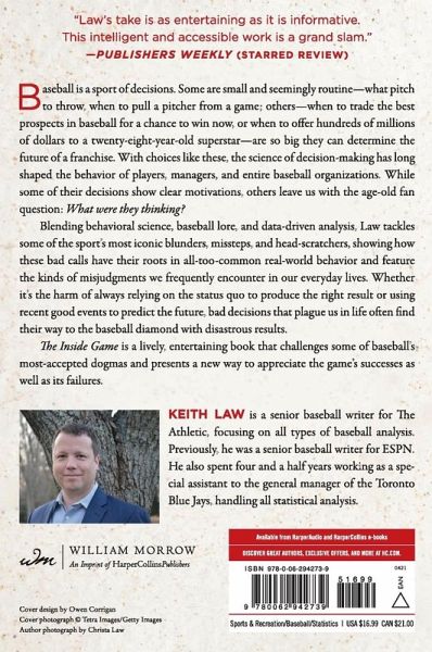 In this groundbreaking book, Keith Law, baseball writer for The Athletic and author of the acclaimed Smart Baseball, offers an era-spanning dissection of some of the best and worst decisions in modern baseball, explaining what motivated them, what can be learned from them, and how their legacy has shaped the game. For years, Daniel Kahneman’s iconic work of behavioral science Thinking Fast and Slow has been required reading in front offices across Major League Baseball. In this smart, incisive, and eye-opening book, Keith Law applies Kahneman’s ideas about decision making to the game itself. Baseball is a sport of decisions. Some are so small and routine they become the building blocks of the game itself—what pitch to throw or when to swing away. Others are so huge they dictate the future of franchises—when to make a strategic trade for a chance to win now, or when to offer a millions and a multi-year contract for a twenty-eight-year-old star. These decisions have long shaped the behavior of players, managers, and entire franchises. But as those choices have become more complex and data-driven, knowing what’s behind them has become key to understanding the sport. This fascinating, revelatory work explores as never before the essential question: What were they thinking? Combining behavioral science and interviews with executives, managers, and players, Keith Law analyzes baseball’s biggest decision making successes and failures, looking at how gambles and calculated risks of all sizes and scales have shaped the sport, and how the game’s ongoing data revolution is rewriting decades of accepted decision making. In the process, he explores questions that have long been debated, from whether throwing harder really increases a player’s risk of serious injury to whether teams actually “overvalue” trade prospects. Bringing his analytical and combative style to some of baseball’s longest running debates, Law deepens our knowledge of the sport in this entertaining work that is both fun and deeply informative.