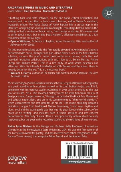 The Inside Songs of Amiri Baraka examines the full length of Baraka's discography as a poet recording with musicians as well as his contributions to jazz and R & B, beginning with his earliest studio recordings in 1965 and continuing to the last year of his life, 2014. This recorded history traces his evolution from the era of Beat poetry and "projective verse," through the period of the Black Arts Movement and cultural nationalism, and on to his commitments to "third world Marxism," which characterized the last decades of his life. The music enfolding Baraka's recitations ranges from traditional African drumming, to doo wop, rhythm and blues, soul and the avant garde jazz that was his great love and the subject of so much of his writing, and includes both in-studio sessions and live concert performances. This body of work offers a rare opportunity to think about not only jazz/poetry, but the poet in the recording studio and the relations of text to score.