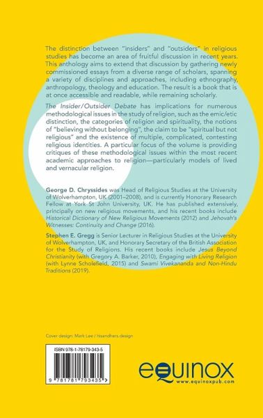 The distinction between "insiders" and "outsiders" in religious studies has become an area of fruitful discussion in recent years. This anthology aims to extend that discussion by gathering newly commissioned essays from a diverse range of scholars, spanning a variety of disciplines and approaches, including ethnography, anthropology, theology and education. The result is a book that is at once accessible and readable, while remaining scholarly. The Insider/Outsider Debate has implications for numerous methodological issues in the study of religion, such as the emic/etic distinction, the distinction between religion and spirituality, the notions of "believing without belonging", the claim to be "spiritual but not religious" and the existence of multiple, complicated, contesting religious identities. A particular focus of the volume is providing critiques of these methodological issues within the most recent academic approaches to religion – particularly models of lived and vernacular religion.